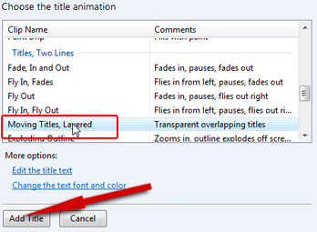 6. Klik Change the title animation untuk mengatur animasi judul. Misal kita pilih Moving Titles Layered. Dan untuk mengatur warna dan jenis font klik Change the text font and color, silahkan atur sesuai keinginan anda. Jika dirasa cukup klik Add Title.